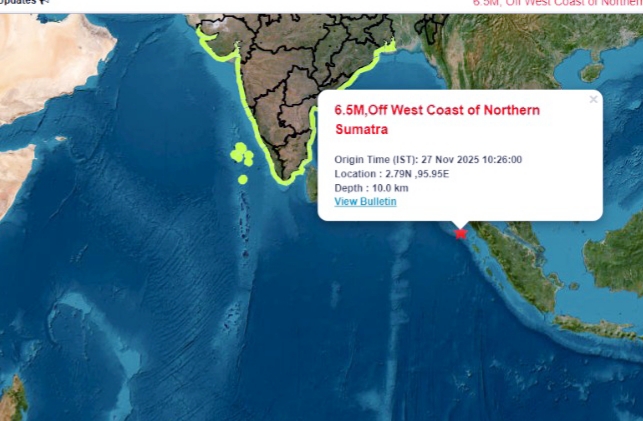ഇന്തോനേഷ്യയിലെ വടക്കൻ സുമാത്രയുടെ പടിഞ്ഞാറൻ തീരത്ത് ( ഇന്ത്യൻ മഹാസമുദ്രത്തിൽ) 6.5 M തീവ്രതയുള്ള ഭൂകമ്പം ഉണ്ടായതായി INCOIS അറിയിച്ചു. ആൻഡമാൻ നിക്കോബാർ ദ്വീപുകളിലെ ഇന്ദിരപോയിന്റ് , ലിറ്റിൽ ആൻഡമാൻ എന്നീ സ്ഥലങ്ങളിൽ ജാഗ്രത നിർദേശം ( watch alert ) നൽകിയിട്ടുണ്ട്. കേരള തീരത്തു നിലവിൽ സുനാമി മുന്നറിയിപ്പ് ഇല്ല എന്നും INCOIS അറിയിച്ചു.