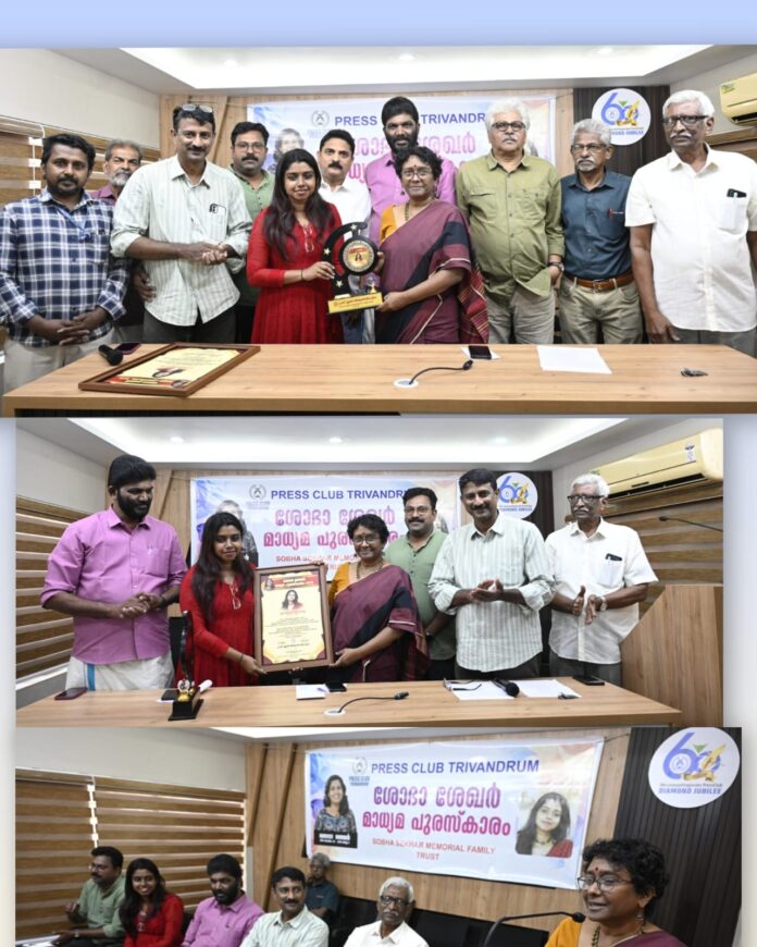 തിരുവനന്തപുരം : അദൃശ്യമായത് ദൃശ്യമാക്കുമ്പോഴാണ് മാധ്യമപ്രവര്ത്തനം അര്ത്ഥവത്താകുന്നതെന്ന് മുന് ചീഫ് സെക്രട്ടറി ശാരദാ മുരളീധരന്. മൂന്നാമത് ശോഭാശേഖര് വനിതാ മാധ്യമ പുരസ്കാര സമര്പ്പണവും ശോഭാ ശേഖര് അനുസ്മരണവും നിര്വഹിക്കുകയായിരുന്നു ശാരദാ മുരളീധരന്. 25001 രൂപയും പ്രശസ്തി പത്രവും ഫലകവുമടങ്ങുന്ന പുരസ്കാരം ഏഷ്യാനെറ്റ് ന്യൂസിലെ ഏയ്ഞ്ചല് മേരി മാത്യു ഏറ്റുവാങ്ങി.